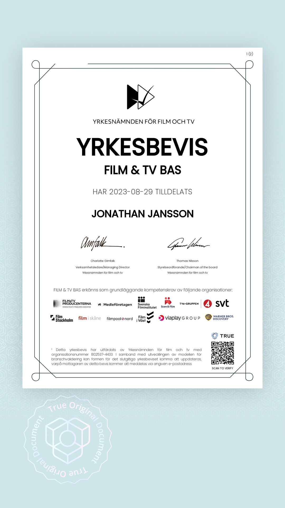 Alla TRUE -document är säkrade med blockchain-teknologi och kan verifieras som äkta. Klicka på verifieringsknappen bredvid dokumentet eller skanna QR-koden med din smartphones kamera. Ingen app krävs - dokumentets äkthet verifieras omedelbart.